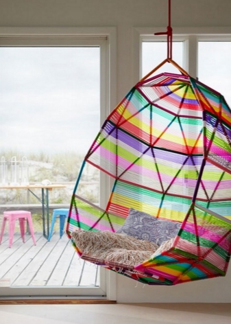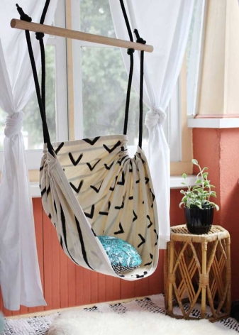 - أطفال. كرسي أرجوحة لحضانة هو حلم كثير من الأطفال. يمكنك إرضائهم عن طريق إنفاق القليل من المال نسبيًا لشراء كرسي معلق من القماش. سوف يسعد النموذج المشرق بأطفالك دون التسبب في الكثير من المشاكل. كقاعدة عامة ، يمكن إزالة هذه الكراسي وغسلها في الغسالة..