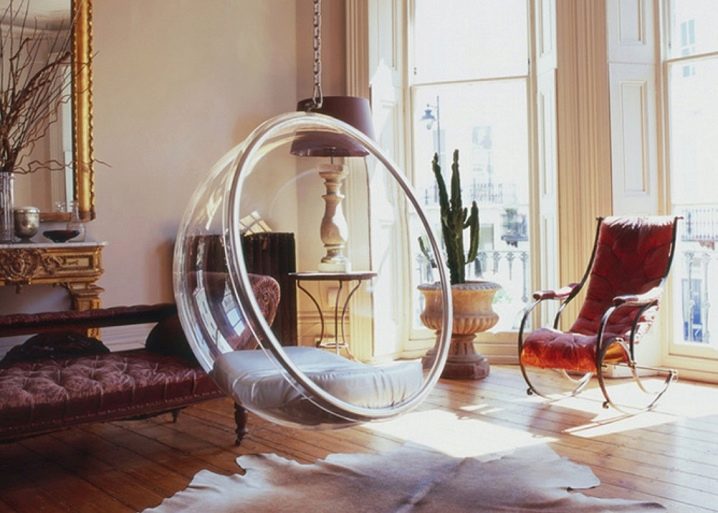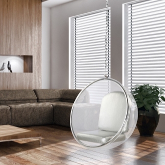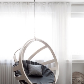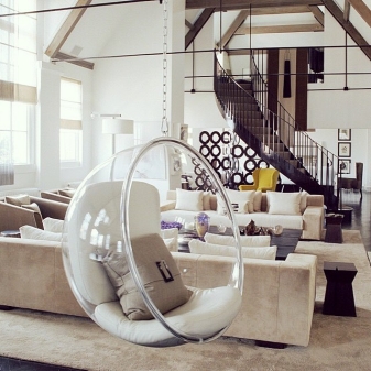 - سوف تتناسب “الكرة” المعلقة المصنوعة من الأكريليك تمامًا مع التكنولوجيا الفائقة البسيطة. يمكن أن يعمل الكرسي الهزاز كلكنة مشرقة إذا اخترت نموذجًا بلون متباين. على خلفية التصميم الداخلي البسيط ، ستبدو مثل هذه التفاصيل مثيرة جدًا للاهتمام..