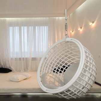 - غرفة نوم. كقاعدة عامة ، يتم استخدام كرسي البيض المعلق في غرفة النوم جنبًا إلى جنب مع شرفة أو في غرفة واسعة جدًا حيث لا توجد منطقة للنوم فحسب ، بل توجد أيضًا منطقة استرخاء. من خلال وضع الكرسي الهزاز بجوار النافذة أو في الزاوية ، سيكون من الممكن إنشاء مكان رائع للاسترخاء..