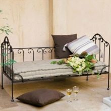 لتنجيد مثل هذا الأثاث ، كقاعدة عامة ، يتم استخدام المطاط الرغوي وبديل الجلد. لمزيد من الراحة ، تم تجهيز بعض المآدب ذات الإطار المعدني بمساند للذراعين.