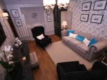 - بروفانس. تصميم داخلي رومانسي مع لمحات من الذوق الفرنسي والتحف والستائر المخرمة والخزامى ستكمل بشكل مثالي الكرسي الإنجليزي مع تنجيد من القماش الخفيف.