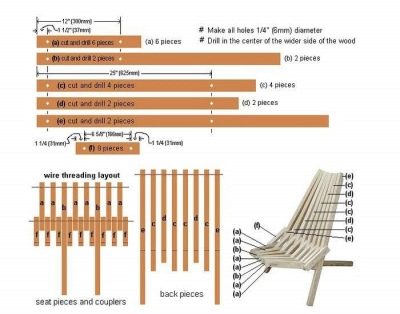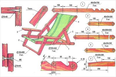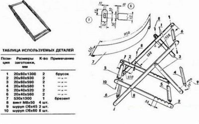 هذا الكرسي الطويل متين للغاية وموثوق ، وظهره قابل للتعديل. بالنسبة لمثل هذا النموذج ، يجب أن تأخذ الألواح الخشبية الصنوبرية ، لأنها مقاومة للتغيرات المناخية. هنا رسم تخطيطي بالأبعاد الموضحة: