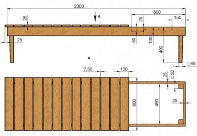 - يتكون الإطار من لوحين متساويين. يتم وضعها بحافة ومتوازية مع بعضها البعض ، والباقي منشور إلى نصفين ومثبت بالقاعدة. والنتيجة هي مقعد بقدمين داعمتين في الخلف..