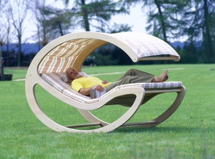 يمكن أن تكون هذه السمة للاسترخاء على شكل كرسي بذراعين أو سرير مع أو بدون مساند للذراعين ، حتى مع وجود سقف يحتمي من أشعة الشمس في كوخ صيفي أو على الشاطئ. لكي يعمل المنتج لسنوات عديدة ، من الضروري اختيار أشجار عالية الجودة: الإبر ، والبلوط ، والصنوبر. إن لوح الخشب الرقائقي المصنوع من هذه الأنواع يكون مرنًا ويمكن معالجته جيدًا.. بالإضافة إلى ذلك ، فإن الخشب الرقائقي نفسه له سعر منخفض وعدد من المزايا: