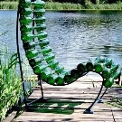 هذه السمة للاستجمام لها عدد من المزايا: مدمجة ، مريحة ، سهلة الطي ، خفيفة الوزن ، متينة وموثوقة ، وتشغل مساحة صغيرة عند طيها. في المظهر يشبه كرسي عالي الظهر. طريقة التجميع غير العادية تبدو أصلية. للقيام بذلك ، ستحتاج إلى قضبان وسلك مجلفن (قطر 4 مم) ونفس الأقواس لتثبيت السلك (16 قطعة) ، كماشة ، ومطرقة. تسير العملية على النحو التالي: