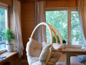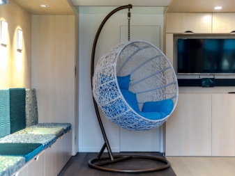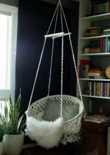 موديلات الكراسي المثبتة في السقف متينة للغاية. كرسي البيض المعلق اللافت للنظر متصل بشعاع السقف بخطاف مقوى. التصميم مضغوط ولا يشغل مساحة كبيرة. صحيح ، لا يمكن نقل كائن فني به مثل هذا التثبيت إلى غرفة أخرى. عيب آخر هو حقيقة أن لا يمكن أن تتوافق جميع التداخلات مع معايير السلامة. في مثل هذه الحالات ، من الأفضل عدم المخاطرة بها ، ولكن اختر الخيار على المنضدة.