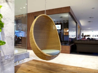 يمكن لكرسي البيض المعلق تزيين ليس فقط غرفة المعيشة. يتم وضعها أحيانًا في غرفة النوم. مع حجم غرفة النوم الكافي ، يتم تثبيت هذا النموذج من الكرسي على المنضدة في زاوية الغرفة أو بجوار النافذة.. في الداخل ، تبدو المواد الطبيعية دائمًا رائعة من صنع القطعة الفنية: الكرمة أو الروطان.. للراحة والجمال ، يمكنك وضع وسائد زخرفية أو بطانية مشرقة على المقعد.