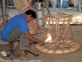 يعد صنع كرسي هزاز من الروطان عملية شاقة إلى حد ما ، لأن قضبانه تحتاج إلى معالجة أولية دقيقة. يتم تنظيف السيقان من اللحاء ، مرتبة حسب السماكة ، على البخار وتقويمها. تُستخدم السيقان الرفيعة لتشكيل الزوايا أو نسج النمط ، بينما تُستخدم الأغصان السميكة لصنع إطار. لإعطاء السيقان شكلًا خاصًا ، يجب تثبيتها على آلة خاصة. في هذا الوضع ، يجب أن يكذبوا لمدة يوم تقريبًا ، وبعد ذلك يتم إزالتها ووضع الأخاديد والشقوق عليها. جميع الأجزاء متصلة أيضًا بالروطان من خلال الفتحات المصنوعة. مما سبق يتم معالجة المنتج بالورنيش أو الشمع بحيث يستمر لأطول فترة ممكنة.