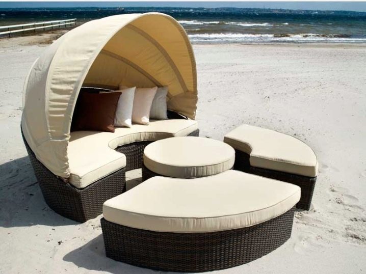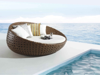 - نماذج باهظة الثمن الروطان الخوص يمكن أن تحتوي كراسي التشمس على مجموعة متنوعة من الأشكال الأصلية وقريبة من الأرائك من حيث الجودة. على وجه الخصوص ، يبدو غير عادي للغاية كرسي الشمس المستدير مع غطاء للشمس وفراش ناعم كبير.