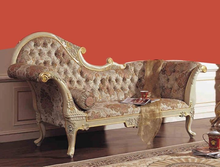 أريكة استرخاء فاخرة باروكية ثابتة تذكرنا بالنماذج الأولية لهذه القطعة من الأثاث. لا يتم شراء كرسي منحوت مغطى بالذهب ليس لتزويد المالكين بمكان للاسترخاء ، ولكن للتأكيد على ثراء الديكور الداخلي للمنزل..