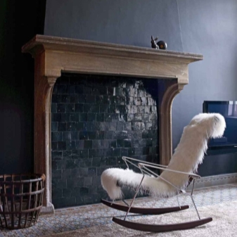 يمكن وضع كرسي هزاز خشبي داكن مع أرجل معدنية ومساند للذراعين بالقرب من مدفأة صلبة في غرفة مظلمة. أكمل هذا الأثاث بغطاء أبيض منفوش.