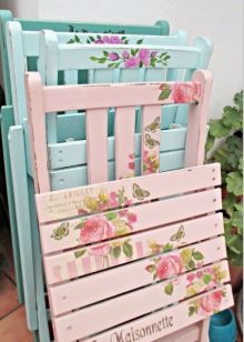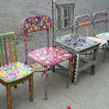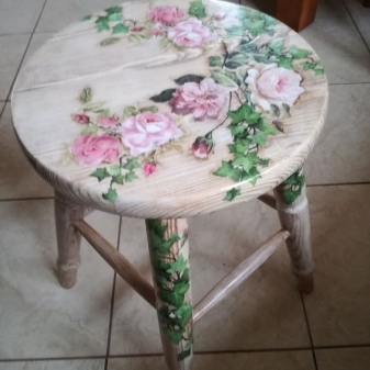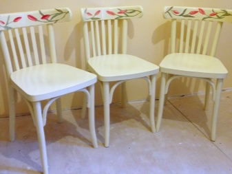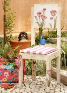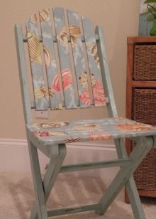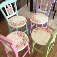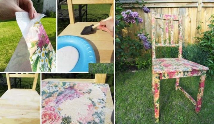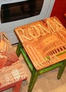 وأخيرًا ، فإن خيار الديكور الأكثر إثارة للاهتمام هو decoupage. إذا كان الأمر كذلك ، يمكنك الحصول على كرسي فيينا المتطور أو مجموعة من المقاعد الملونة المصنوعة من الكراسي القديمة المتهالكة. تستخدم ورقًا رقيقًا أو مناديل. ومع ذلك ، يجب مناقشة المواد بشكل منفصل..