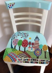 يمكنك أيضًا تزيين الكرسي بالطلاء والفرش وطبقة إضافية من الورنيش. هذه الطريقة مناسبة إما لأولئك الذين يعرفون كيفية الرسم بشكل جميل ، وتحويل كرسي أبيض بسيط إلى تفاصيل داخلية مشرقة ، أو لأولئك الذين يريدون فقط تقادم الأثاث. قم بالطلاء على قاعدة الكرسي أو الأرجل ، وامش على السطح بورق الصنفرة ، وستفاجأ بنفسك بمدى جمال النتيجة..