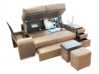 تحتوي الأرائك الذكية أيضًا على مساند أذرع جلدية خاصة ليست ناعمة ومريحة فحسب ، بل يمكن أن تحتوي أيضًا على ميزات مدمجة. قد تحتوي على ميني بار ، وأدراج ، ورفوف ، وإضاءة LED ، بالإضافة إلى لوحة تحكم مركز الموسيقى.