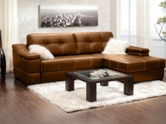 سيكون الخيار الأسهل هو شراء أريكة جلدية زاوية مع مسند. في نماذج من هذا النوع ، غالبًا ما يكون الجزء المرئي فقط من التنجيد مصنوعًا من الجلد الأصلي. باقي السطح مصنوع من الجلد أو الجلد البيئي أو الجلد. تسمح مثل هذه الخطوة للشركة المصنعة بتقليل تكاليف إنتاج النموذج وتحويل التكلفة إلى شريحة أسعار الميزانية ، ولكن نتيجة لذلك ، فإن هذه الأسطح بلا شك تتآكل بشكل أسرع وتتطلب ترميمًا..