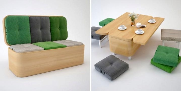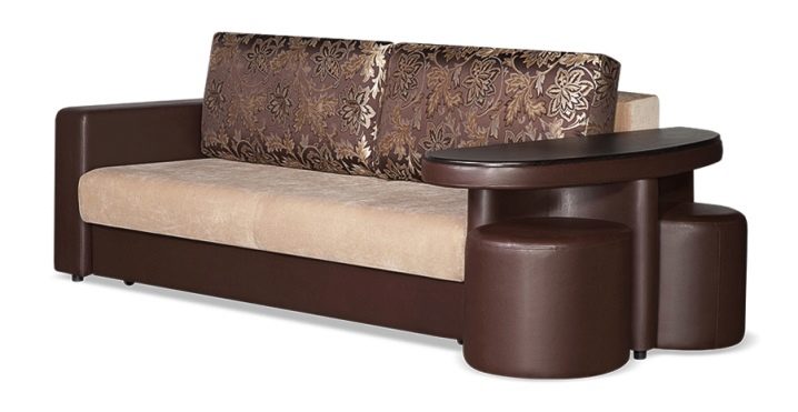 لا يمكن لهذا الخيار أن يجمع بين شيئين فحسب ، بل حتى أربعة أشياء مفيدة. يمكنك شراء أريكة أصلية مع طاولة تتلاءم بنجاح مع ديكور منزلك. لتصنيع مثل هذا الأثاث ، يتم استخدام المنسوجات أو الخشب الرقائقي أو البلاستيك. يمكنك إظهار خيالك وإعادة ترتيب الوحدات إذا كنت ترغب في ذلك. لذلك ستحصل على تركيبة مختلفة تمامًا ، والتي ستكون قادرة على إنشاء مجموعة متنوعة من الأثاث..