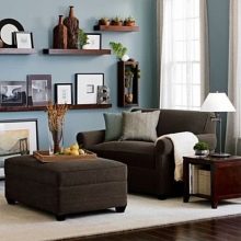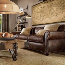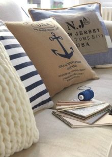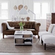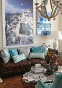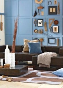 يمكن تزيين الأريكة ذات اللون البني في داخل غرفة المعيشة بعناصر زخرفية مختلفة مصنوعة بأسلوب بحري. إطارات الصور وعجلة القيادة المزخرفة وأحجار البحر والأصداف والمنسوجات بدرجات اللون الأزرق السماوي – كل هذا يخلق جوًا من الراحة والسلام والهدوء والتناغم.