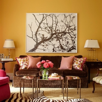 سيبدو اللون البني الهادئ مثيرًا للاهتمام مع الألوان الزاهية. على سبيل المثال ، يمكنك لعب أريكة في ظل طبيعي مع عناصر زخرفية ملونة. يمكن أن تكون هذه الوسائد مصنوعة بألوان الأخضر الفاتح والفيروزي والوردي الساخن. أكمل الغرفة بتركيبات الإضاءة مع أباجورة بألوان زاهية ، وضع نباتات داخلية بأواني صفراء وبرتقالية وخضراء على النوافذ وسترى كيف ستتحول غرفة المعيشة الخاصة بك.