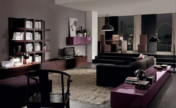 - الداخلية الأسود والأرجواني. هذا هو مزيج صوفي ومثير للاهتمام للغاية من الألوان ، معربا عن شفقة القوطي. على خلفية الأثاث الأرجواني ، تبدو الأريكة السوداء مذهلة وساحرة.