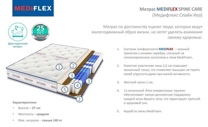 يوجد في قلب مرتبة Mediflex كتلة زنبركية مكونة من 11 منطقة ، والتي عمل فالنتين ديكول بنفسه. في الوقت نفسه ، تم أخذ جميع ميزات أمراض العمود الفقري في الاعتبار. بالإضافة إلى ذلك ، هناك كتلة مقواة حول المحيط ، مما يسهل الخروج من السرير ، كما أنه يجعل الجلوس عليه مريحًا. كما أنه يمنع الفراش من التشوه..