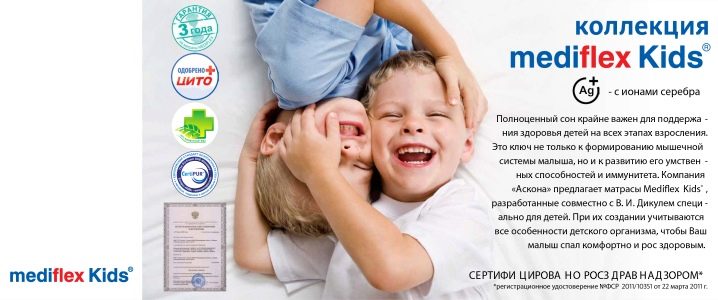 تتميز مراتب Mediflex بالعديد من الطرز ، مما يسمح لك باختيار المنتجات التي تناسبك فقط. تحتوي فئة المنتج هذه على خط كامل مصمم خصيصًا للأطفال وليس فقط: