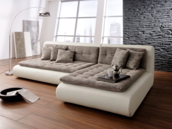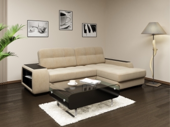 يحتوي النموذج المصمم على شكل حرف L على عدد كبير من المقاعد ، ويمكن للأشخاص الذين يجلسون على مثل هذا المنتج التواصل بحرية مع بعضهم البعض ، والنظر في عيون المحاور. تسمح لك نماذج الركن بعدم إنفاق الأموال على شراء الكراسي بذراعين – يتم لعب دورها بجانب الأريكة.