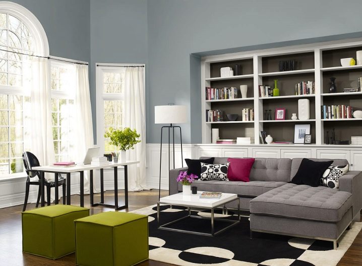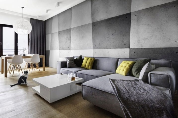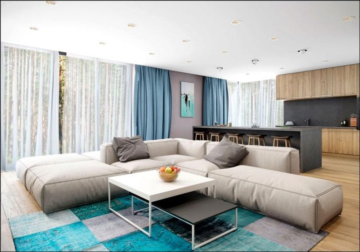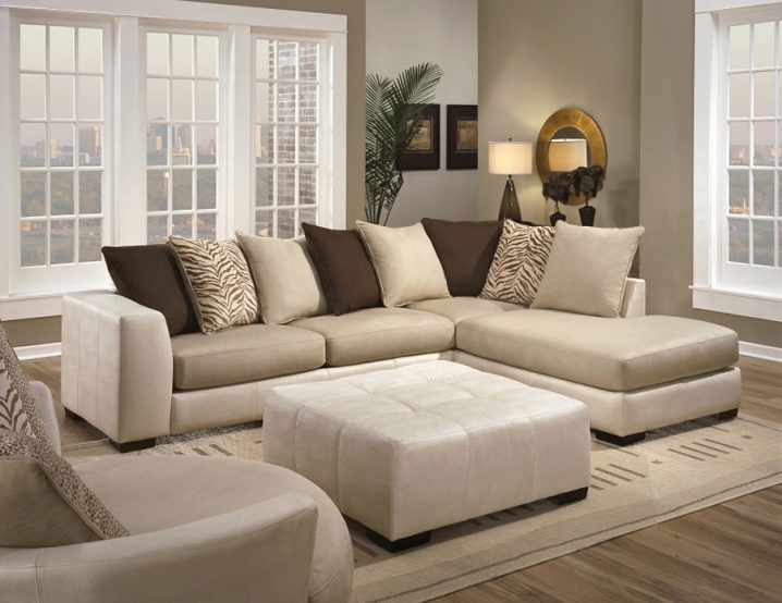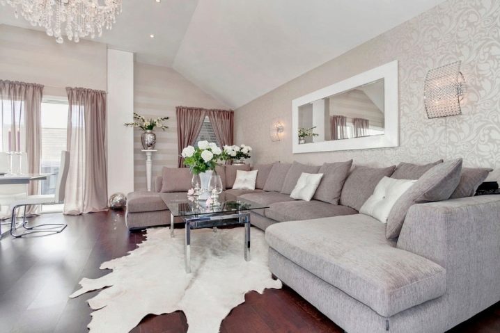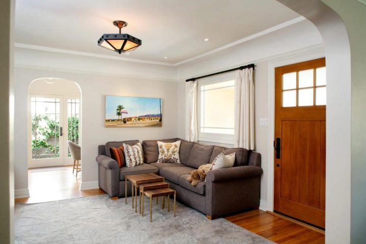 مع أريكة زاوية مقطعية ، ستبدو غرفة المعيشة فسيحة ، حتى لو كانت المساحة محدودة للغاية.. تتميز الأريكة بلون أردوازي عملي ، ولكنها لا تبدو ضخمة بفضل مساند الذراعين المستديرة والخطوط الناعمة للوسائد والمقعد. تساعد السجادة البيضاء على الأرض على خلق انطباع بوجود مساحة ، وبما أن الأريكة في الزاوية ، فهناك أيضًا مساحة كافية في الغرفة لكرسي ناعم أو مسند عثماني. سيكون الإكمال العضوي للتكوين عبارة عن طاولة مصغرة في وسط الغرفة ومصباح أرضي بالقرب من مسند الذراع ، يضيء الشفق الناعم في المساء..