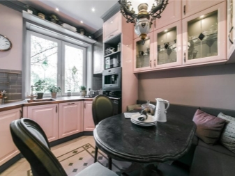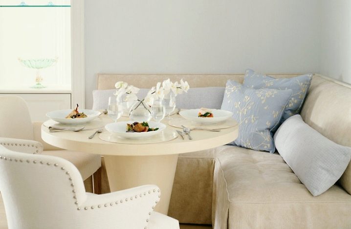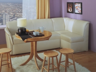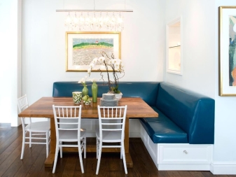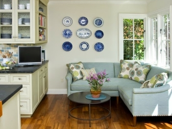 يمكنك وضع أريكة زاوية صغيرة في المطبخ أو في الردهة. عندما لا توجد مساحة كافية في المطبخ لمساحة كبيرة أو واسعة لتناول الطعام ، فإن أريكة الزاوية على شكل حرف L تعد خيارًا جيدًا. من خلال تثبيته على جدار مع نافذتين ، ستتاح للمقيمين فرصة الاستمتاع بمنظر جميل ، وفي الصيف ، مع نافذة مفتوحة ، سيتمكنون من الشعور كما لو كانوا في شرفة في الهواء الطلق. سيعطي لون الباستيل الرقيق لمثل هذا الأثاث الإضاءة للداخل بأكمله ، وسيكون منسجمًا مع الجدران المطلية بلون أفتح والأرضيات المصنوعة من الخشب الطبيعي. ستكون طاولة الطعام الصغيرة أو طاولة القهوة عملية ومنطقية في هذا الجزء الداخلي.