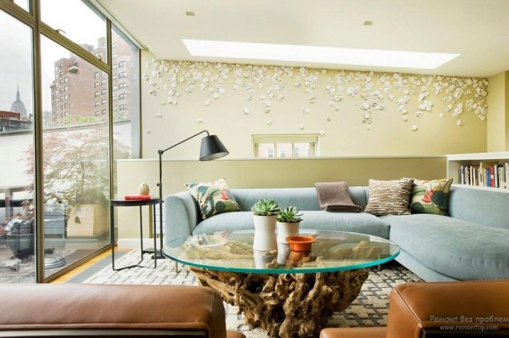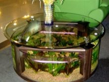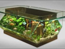 طاولة القهوة مع سطح طاولة حوض السمك تثير إعجاب أي شخص. الحوض ليس صغيرًا ، حقيقيًا ، تسبح فيه الأسماك والنباتات الحية. مما لا شك فيه أن هذه التفاصيل في الداخل ستكون أكثر ما لا ينسى.