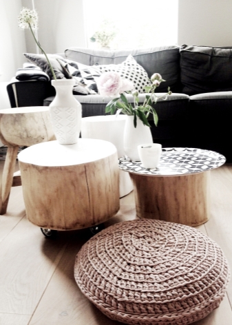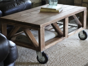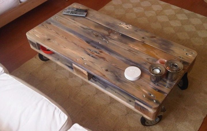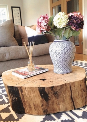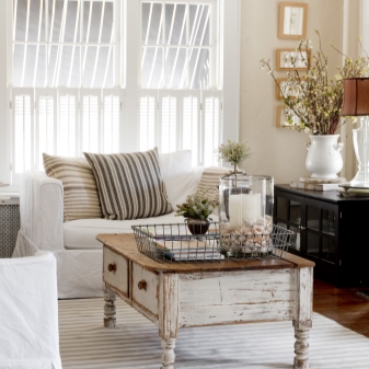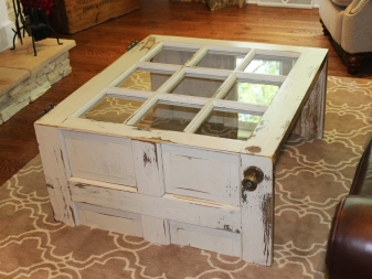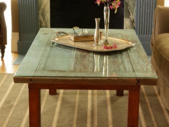 أي شيء يمكن أن يتحول إلى طاولة قهوة صغيرة. على سبيل المثال ، تمت إزالة ورقة باب خشبية من مفصلاته ، والتي تم إضافة الأرجل إليها. لا يتم تنظيف الطلاء القديم عمدًا ، ولكن على العكس من ذلك ، يتم تلميعه ، مما يحافظ على “آثار الزمن”. يمكنك ترك القفل أو المقبض. عن طريق القياس ، مثل سطح الطاولة ، يمكنك أن تأخذ نافذة خشبية عن طريق وضع زجاج مقسّى في الإطار.