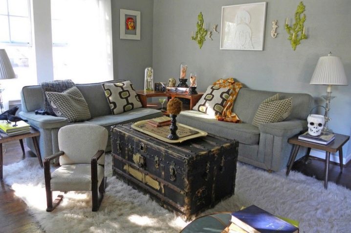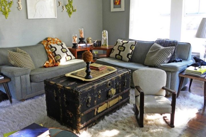 تتناسب طاولات الصدر بشكل جيد مع النمط بلد أو كلاسيكي. في بعض الأحيان يلعب الصندوق الحقيقي دور طاولة القهوة. هذا يخلق راحة إضافية ، لأنه في الداخل يمكنك ترتيب نظام تخزين لمجموعة متنوعة من العناصر ، وكذلك ترتيب شريط المنزل.