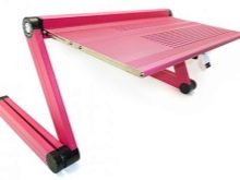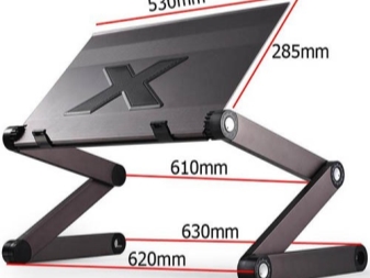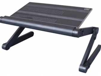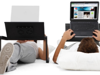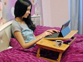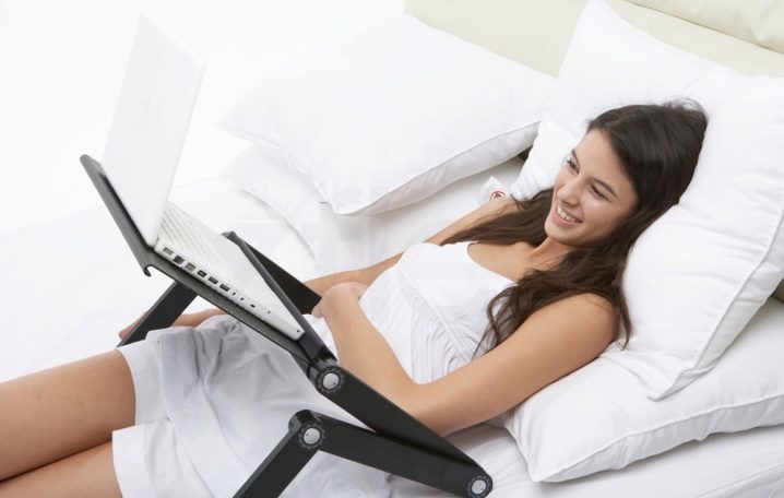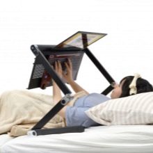 الميزة الكبيرة لهذه الجداول هي أنها يمكن أن تجعل استخدام الكمبيوتر المحمول أمرًا مريحًا للغاية. يمكنك العمل مع هذا الجهاز أو مجرد مشاهدة الأفلام وقراءة الكتب ، حتى إذا لم يكن لديك مكان عمل مخصص لذلك. يمكن وضع هذه الجداول حرفيًا على نفسك. وزنهم عادة لا يزيد عن 2 كجم. لكن التصميم نفسه موثوق للغاية ويمكن أن يتحمل حتى نماذج الكمبيوتر المحمول الكبيرة التي يتراوح وزنها بين 12 و 15 كجم.