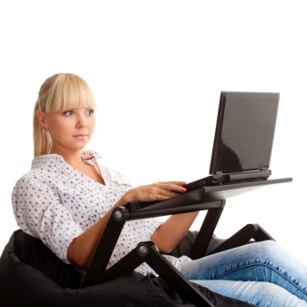 - طاولة سوفا. عادةً ما يتم استخدام هذا المحول لجهاز الكمبيوتر المحمول أثناء العمل أو مشاهدة الأفلام أثناء الاستلقاء على السرير أو الجلوس على كرسي مريح. لديهم ساقان تبطن حواف قدميك..