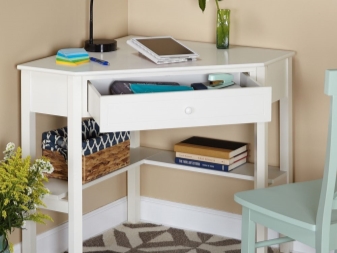 بفضل تصميم هذه الطاولة ، يمكن تثبيتها بالقرب من الحائط. طاولة الزاوية ستوفر مساحة كبيرة في المنزل. هذا الخيار مناسب بشكل خاص للشقق الصغيرة التي توجد فيها مساحة خالية صغيرة. في هذه الحالة ، سيكون جدول الزاوية أكثر ربحية من الجدول المستطيل..