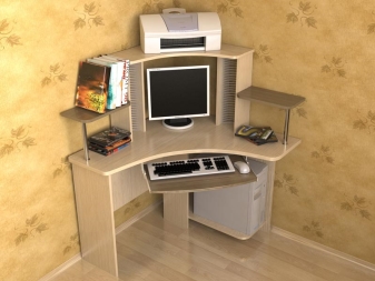 مكتب كمبيوتر الزاوية له وضع قطري عمودي. الحجم الأمثل لهذا النموذج هو 140 × 130 سم ، وتكون طاولات الكمبيوتر هذه مريحة للغاية. إنها ليست ضخمة ، وفي الوقت نفسه ، هناك مساحة كافية خلفها. يمكن لأي شخص أن يقرأ أو يكتب ويعمل على الكمبيوتر بالتوازي. سيكون الحجم المماثل للمنتج كافيًا لتركيب طاولات بجانب السرير مع أدراج ورفوف..