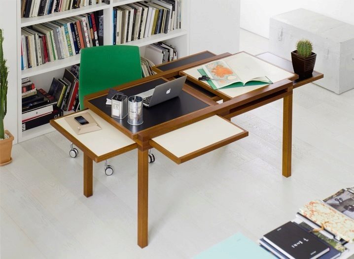 لقد اعتدنا على حقيقة أن المكتب عادة ما يشغل مساحة كبيرة إلى حد ما. لكن النماذج المتحولة تغير هذا الظرف. عند طيها ، فإنها عمليا لا تشغل مساحة الغرفة.