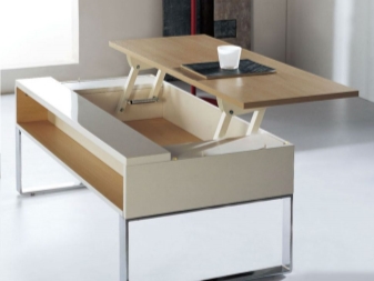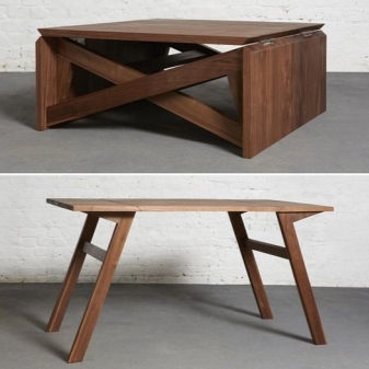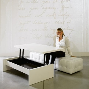 - عينة مطابقة للسرير. يمكن تثبيت هذا الجدول بسهولة في مسكن صغير ، على سبيل المثال ، في غرفة النوم. يمكنك استخدام الطاولة خلال النهار ، وإذا لزم الأمر ، يمكنك تحويلها إلى سرير. في هذه الحالة ، يمكنك ترك المصباح والمستندات على الطاولة. لن يتدخلوا في التحول.