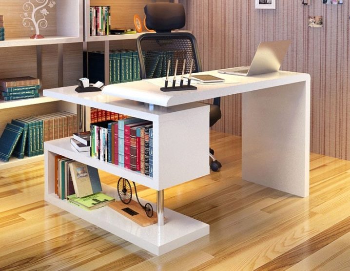 إذا كنت تستخدم الكثير من المواد المطبوعة (الكتب والمستندات والمجلات وما إلى ذلك) والأدوات المكتبية ، فاختر طاولة كتابة مع رفوف وحوامل لكل ما تحتاجه.