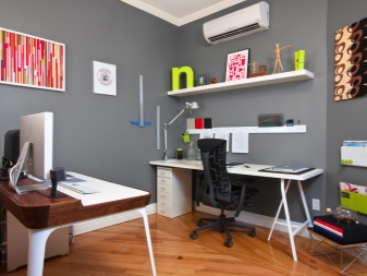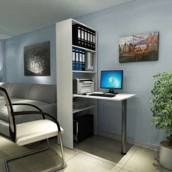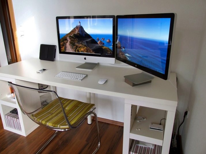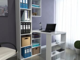 الحل الفريد لإنشاء مكان عمل لشخصين هو نموذج يتضمن مكتبي كمبيوتر أبيض متصلين بواسطة رف صغير. ستساعدك الأرفف المفتوحة على ترتيب جميع العناصر والأشياء بشكل ملائم. يشغل الترتيب الأصلي للطاولات مساحة خالية قليلاً. يعتبر الاكتفاء والوظيفة من المزايا الرئيسية لمثل هذا المنتج..