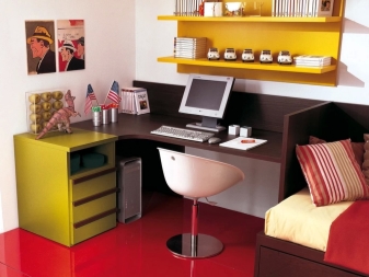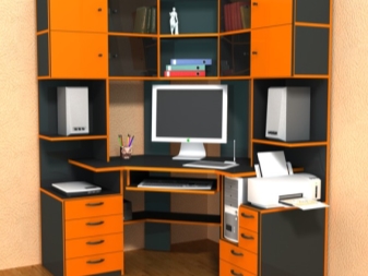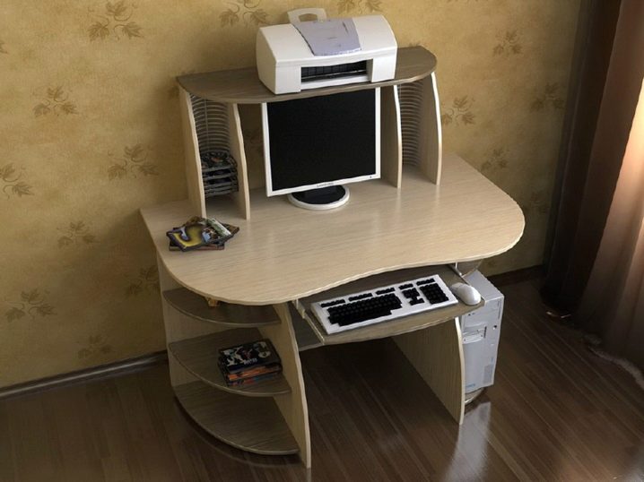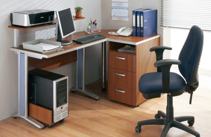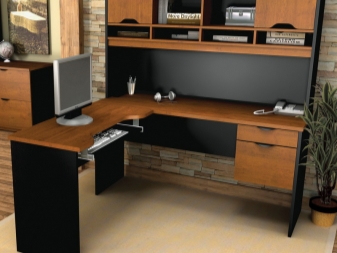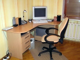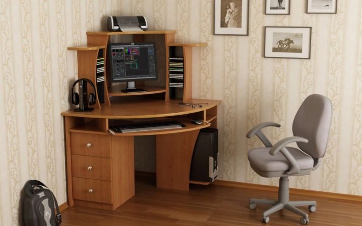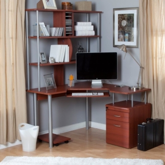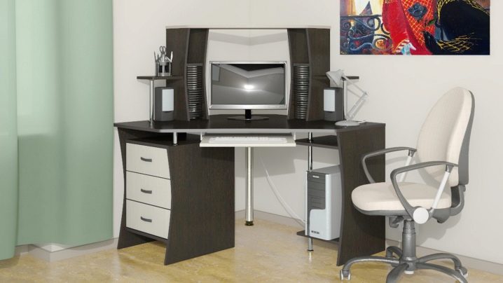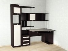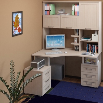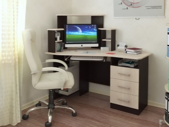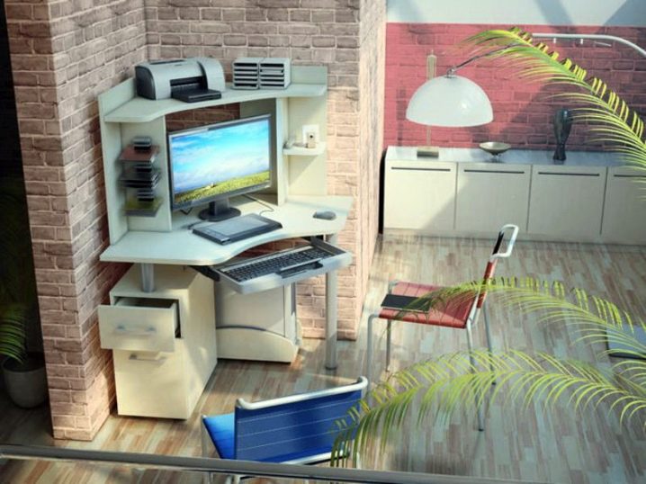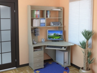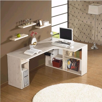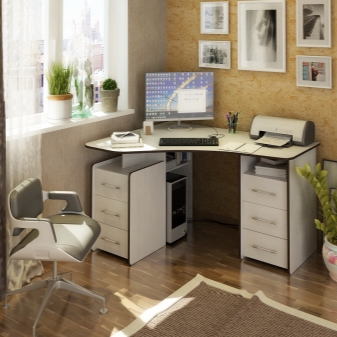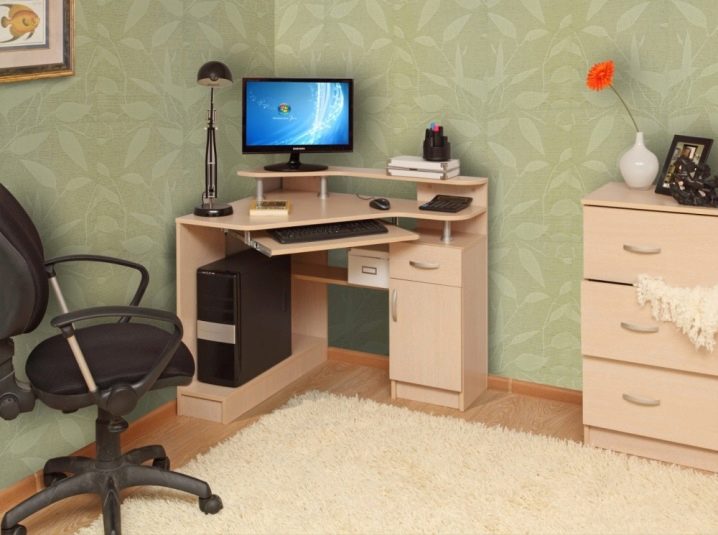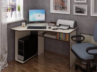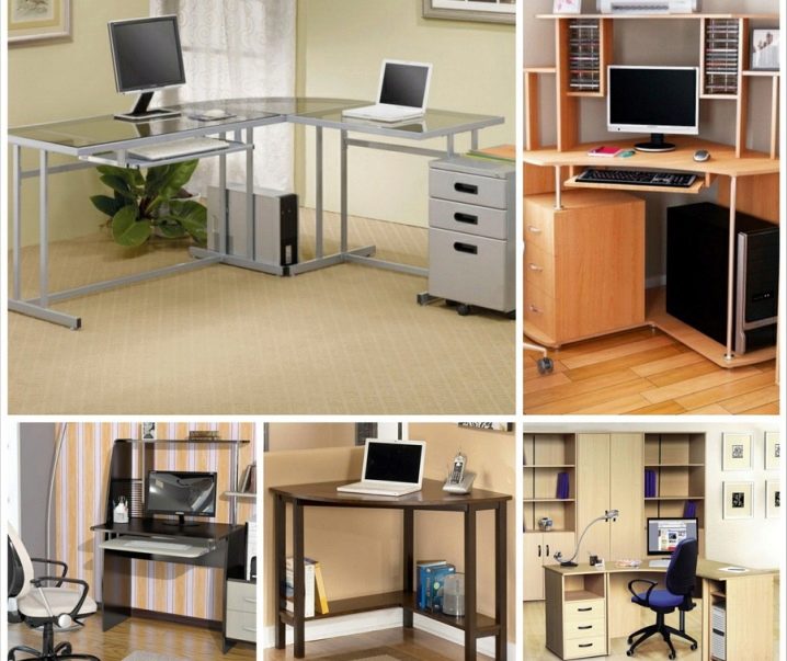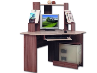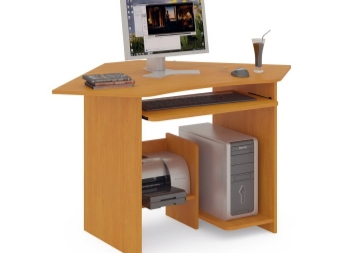 نسخة شائعة وشائعة إلى حد ما من مكتب الكمبيوتر ، إلى جانب واحد بسيط مستقيم ، هو ركن واحد. ميزتها الرئيسية هي الاكتناز والاقتصاد فيما يتعلق بالمساحة ، والتي تحظى بتقدير خاص في الشقق الصغيرة. كما أنها أكثر ملاءمة بسبب ميزات التصميم..