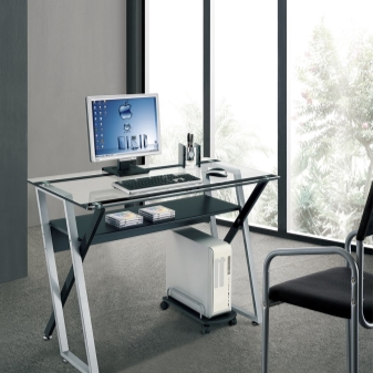 - طاولات الكمبيوتر المعدنية عبارة عن إطار حديدي وسطح طاولة زجاجي أو خشبي. إنها أقوى وتستمر لفترة أطول من تلك الخشبية ، لكنها غالبًا لا تنسجم مع الجزء الداخلي للشقة. لذلك ، غالبًا ما أستخدمها في المكاتب. عادة ما تكون مادة البداية من الألومنيوم أو الفولاذ المقاوم للصدأ.