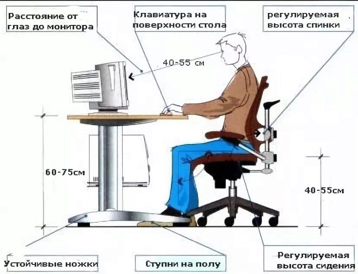 يمكن أن يتسبب ارتفاع سطح المكتب المختار بشكل غير صحيح في إعاقة بصرية وانحناء العمود الفقري. بالإضافة إلى ذلك ، أثناء العمل ، يتعب الشخص بشكل أسرع ويشعر بعدم الراحة. يؤثر ارتفاع الطاولة على الوضع الذي سيجلس فيه الشخص أثناء العمل خلفه. طاولة منخفضة للغاية تجعلك تنحني ظهرك وتنحني إلى الأمام قليلاً ، وتجبرك الطاولة المرتفعة بدورها على إبقاء رأسك مرفوعاً.