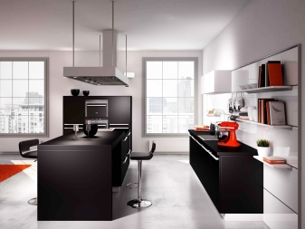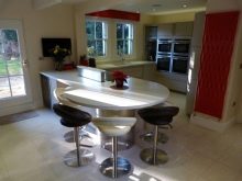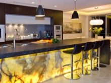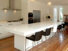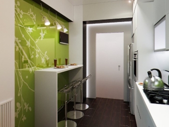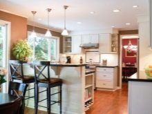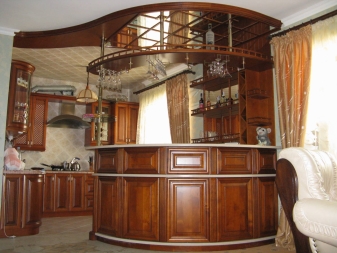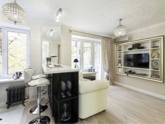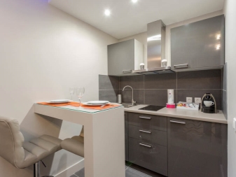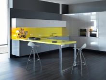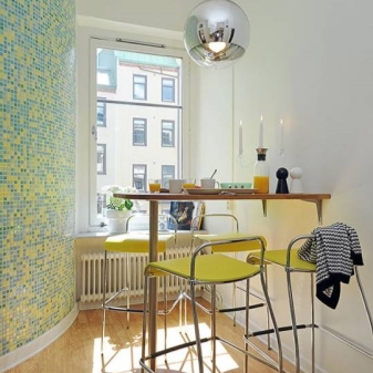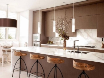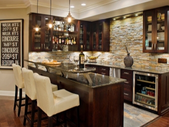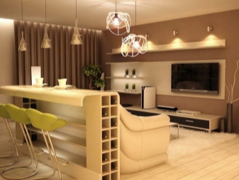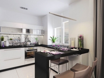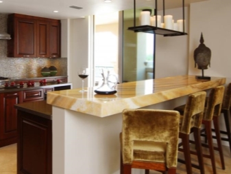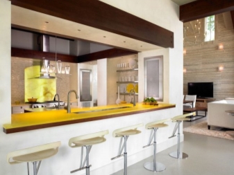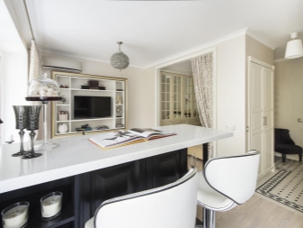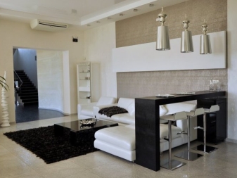 - ميزة أخرى لهذا الأثاث هي أن طاولة البار بها كراسي يسمح لك بتحديد المساحة. يمكنك فصل منطقة إعداد الطعام عن منطقة تناول الطعام العائلية. هذا ينطبق بشكل خاص على شقق الاستوديو الحديثة التي تتصل فيها غرفة المعيشة بالمطبخ..