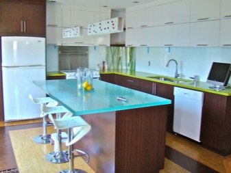 أما بالنسبة لظهور أسطح العمل الزجاجية ، فكل شيء ليس بهذه البساطة أيضًا. بالإضافة إلى الزجاج الشفاف الكلاسيكي ، يمكنك استخدام أسطح زجاجية أخرى أيضًا. غالبًا ما يكون هذا زجاجًا مصنفرًا أو سطحًا مزينًا ببعض الأنماط المثيرة للاهتمام..