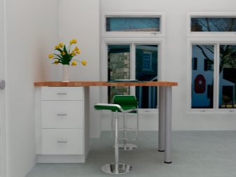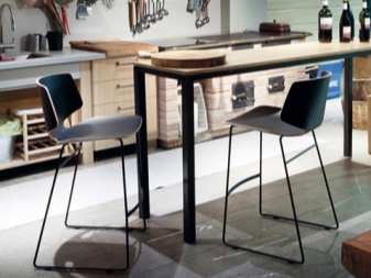 بالنسبة للعيوب ، تجدر الإشارة إلى أن هذا الخيار لن يبدو مناسبًا للجميع. يجد الكثير من الناس أنه من غير المريح الصعود إلى الكراسي العالية طوال الوقت. هذا ينطبق بشكل خاص على النساء الحوامل وكبار السن. لذلك بالنسبة لأولئك الذين يعيشون مع آباء ناضجين ، فإن هذا الأثاث بالكاد مناسب. أيضًا ، لا يحب الكثيرون مثل هذا الأثاث من الناحية الجمالية البحتة ، لأنه يبدو وكأنه جزء من المناطق الداخلية لبعض المقاهي أو النوادي ، وليس عشًا عائليًا مريحًا..