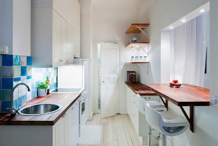 خيار آخر مثير للاهتمام هو جدول التحويل. هذه الطاولة بالذات هي الحل الأفضل لأصحاب المطابخ الصغيرة. هناك عدة خيارات لمثل هذه الجداول في وقت واحد: يمكن أن تكون قابلة للطي أو قابلة للطي أو على عجلات.