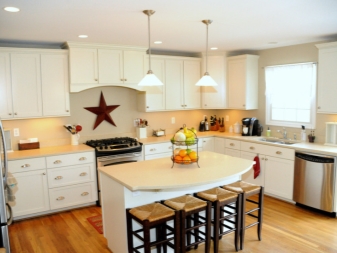 خيار آخر مثير للاهتمام لاستخدام طاولة البار والكراسي هو تثبيتها على شكل جزيرة. هذا صحيح بالنسبة للاستوديوهات حيث توجد مساحة خالية كافية. الجزيرة عبارة عن نظام مسبق الصنع يتكون من عدة عناصر وظيفية منفصلة. بالإضافة إلى كونترتوب بسيط ، يتم استكمال هذا التصميم أحيانًا بحوض وموقد. ومع ذلك ، هذا هو الخيار الأكثر عملية..