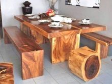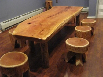 عادة ما يكون لطاولات الكوخ الصيفي أو الشرفة شكل مستطيل أو دائري قياسي. ومع ذلك ، هناك حرفيون تمكنوا من صنع طاولة ذات طراز ريفي على شكل جذع ، ومقعد على شكل سجل ، والذي يبدو مثيرًا للإعجاب. يتم استكمال هذه المجموعة بسهولة بمقاعد مقطوعة على شكل خشب بنفس الأسلوب. كما ترى ، فإن صنع طاولة خشبية بنفسك هو عمل بسيط..