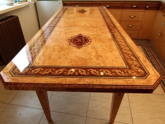 الخيار الأكثر شيوعًا للتشطيب الزخرفي للطاولة الخشبية هو تغطية سطحها بورنيش شفاف أو ملون ، مما يؤكد على نمط الخشب الطبيعي ويوفر حمايته من العوامل الخارجية..