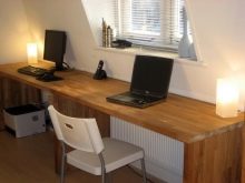 يمكنك إنشاء مكتب من اللوح. المواد مركبة وبأسعار معقولة جدا. لكن لها الكثير من العيوب. اللوح الحبيبي يخاف من الرطوبة – لم يعد خيارًا للمطبخ. إنه لا يحمل المسامير والبراغي جيدًا – صعوبات غير ضرورية في العمل. وبشكل عام فهي ليست صديقة للبيئة – من الأفضل عدم الاحتفاظ بالكثير من منتجات الألواح الخشبية في الشقة. ومع ذلك ، يمكن وضع مثل هذا الجدول ، على سبيل المثال ، في منزل أو على شرفة أرضية في البلد – كخيار مؤقت وغير مكلف – لموسم واحد لاستقبال الضيوف. غير مكلفة وبسيطة وممتعة من الناحية الجمالية ، والأهم من ذلك – وظيفية.